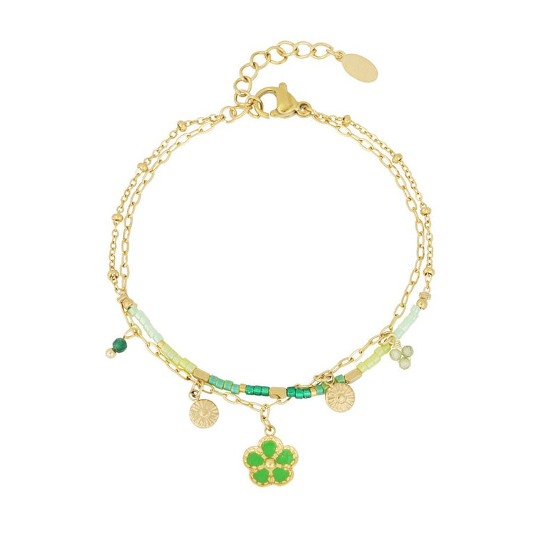 Il charm centrale a forma di fiore smaltato, disponibile in fucsia o verde, dona un tocco allegro e luminoso, mentre i piccoli pendenti dorati completano il design con movimento e originalità.