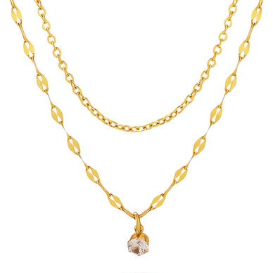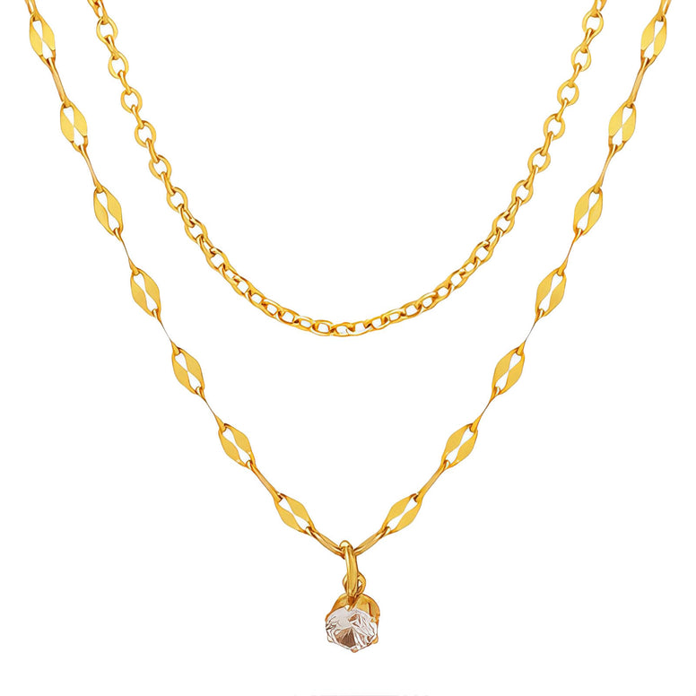 La collana Horus Doppia Luce unisce eleganza e simbolismo in un design raffinato e moderno. Realizzata in acciaio placcato oro 18K, presenta una doppia catena: una più sottile e lineare, l'altra caratterizzata da maglie geometriche luminose, che creano un effetto stratificato ricco e armonioso.