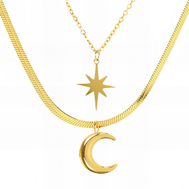 Il primo giro, una catena elegante e luminosa, abbraccia il collo con delicatezza e porta con sé la stella a otto punte; il secondo, più strutturato, custodisce una luna dorata dal design morbido e moderno.