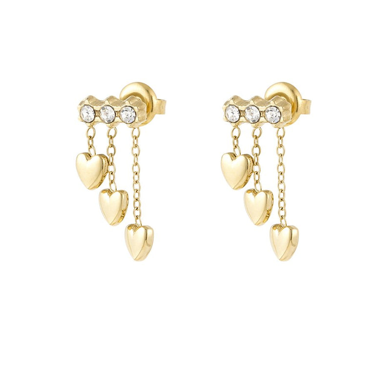 Delicati orecchini placcati oro 18k, impreziositi da tre luminosi cristalli e piccoli cuori pendenti che si muovono con grazia ad ogni passo. Romantici e raffinati, evocano la leggerezza di gocce di rugiada al mattino, portando un tocco di dolcezza e luce al tuo look quotidiano.