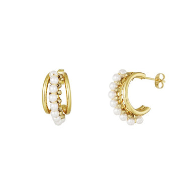 Eleganti orecchini a cerchio placcati oro 18k, impreziositi da una delicata fila di perle bianche che donano raffinatezza e luminosità ad ogni look. Perfetti da indossare sia di giorno che di sera, uniscono il fascino senza tempo delle perle al design moderno del cerchio dorato.